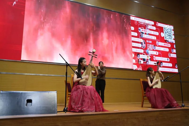 民乐团带来表演《赤焰之缨》,表演者分别是林娉汝、柳杨、黄雨乐。琵琶声、笛声交合而鸣,迸发出昂扬向上的力量。
