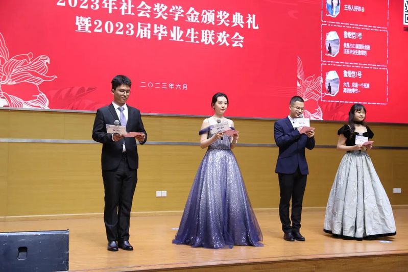颁奖仪式结束后,法学院2023届毕业生联欢会拉开序幕。2023届毕业生冯可萱、鲁煜恺、付玥洁、戴子昂主持联欢会。