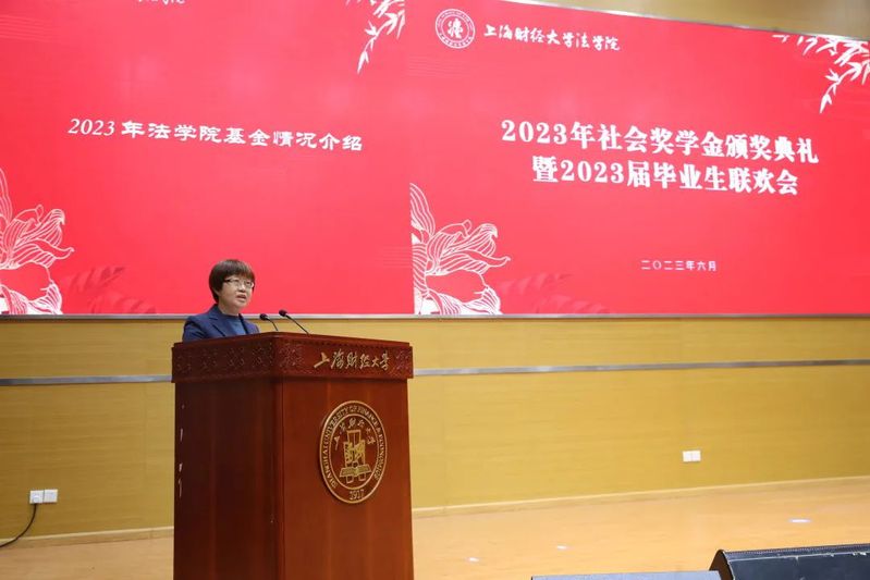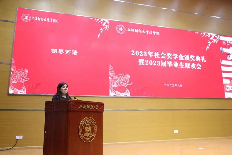 上海政法学院副校长、上海财经大学法学院教授委员会主任郑少华,上海财经大学党委常委、统战部部长周杰普,上海财经大学合作发展处处长、教育发展基金会秘书长陈红梅,上海财经大学党委学生工作部/研究生工作部副部长方卉,法学院院长宋晓燕,法学院党委书记罗山鸿,法学院副院长朱晓喆,法学院副院长郝振江,法学院教师代表,2023届毕业生和2023年社会奖学金获奖学生出席了此次典礼。2023年社会奖学金颁奖典礼由法学院党委副书记齐宁主持。
