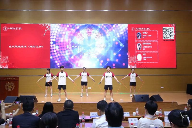 上海财经大学跳绳队带来开场表演《绳财飞扬》,表演者:游小草、吴若玎、倪可莹、王子昂、王晨瑞。毕业生们即将各自奔向天涯,但始终还会有一根斩不断的绳连接着你、我、他,牵引着彼此之间名为“上财人”的羁绊。现场气氛热烈,表演者的各种“花招”引得全场掌声不断。