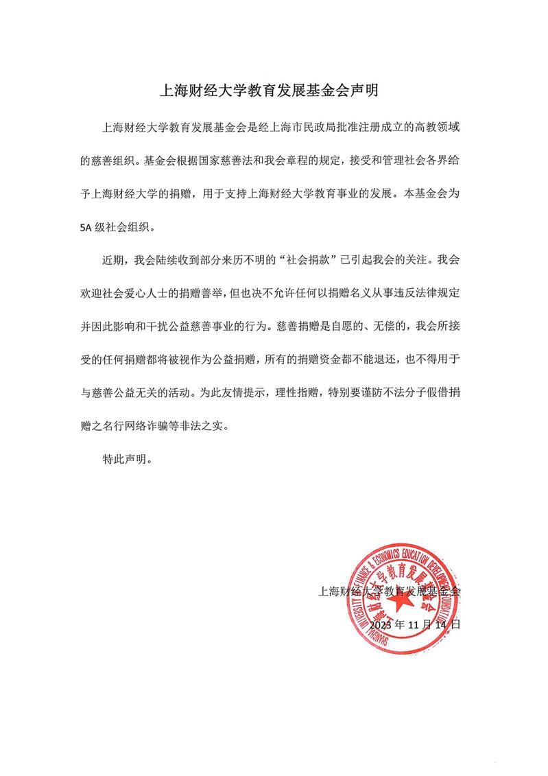 上海财经大学教育发展基金会声明