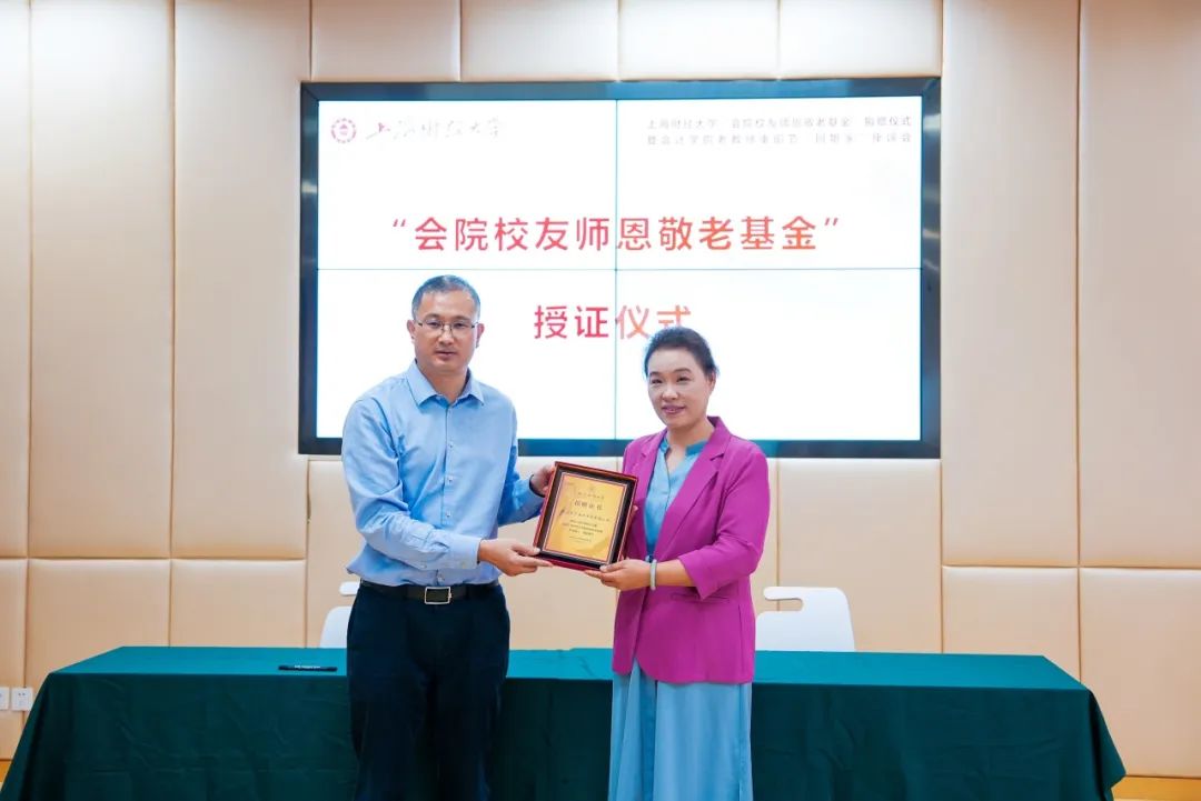 上海财经大学副校长、基金会理事长李增泉向邬建辉校友、刘连功校友、张冬梅校友颁发“会院校友师恩敬老基金”捐赠证书。
