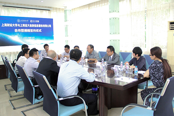 会谈伊始,方华副校长首先对贺牧总经理一行的到来表示欢迎,并向其简要介绍了上海财经大学的历史沿革、人才培养、师资队伍、科研成果等发展概况,着重就上海财大人才培养的规模和结构,科学研究的水平和现状进行了阐述。方华副校长指出,上海财经大学积极投身于校企合作,广泛开展了形式多样的合作模式与交流,此次与上海证大金融信息服务有限公司的合作,将开启校企合作的又一篇章,这既是学校自身发展的总要求,也是推动中国商学教育前进的源动力,更是促进企业又快又好发展、助力中国经济前进的催化剂。