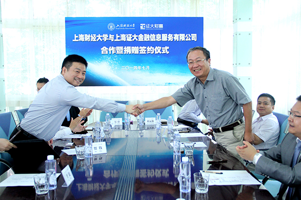 7月28日,上海证大金融信息服务有限公司总经理贺牧、副总经理刘捷一行七人来访我校,就双方合作与捐赠一事进行交流并正式签约。上海财经大学副校长方华、商学院常务副院长骆玉鼎及副院长薛丽萍、合作发展处副处长姜晖一同会见了来访客人。