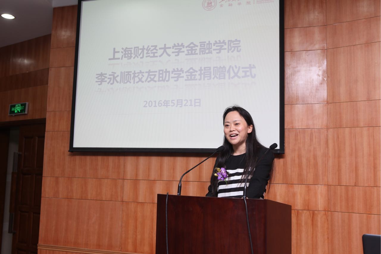 捐赠仪式于下午1:30准时举行。仪式由金融学院常务副院长刘莉亚老师主持,首先,校合作发展处陈红梅老师代表校合作发展处、校教育发展基金会回顾了校友工作对学生创业、校园建设、人才引进等方面的重要性。她指出,正是像李永顺这样的优秀校友,关注支持母校的发展、助力母校学子成长成才,在不同的社会角色上用他们的方式表达对母校的爱。