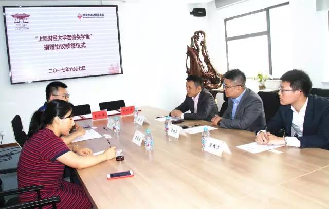 6月7日下午,“上海财经大学宏信奖学金”捐赠续签仪式在我校创业中心202会议室举行。北京宏信公益基金会秘书长徐颂华、远东宏信有限公司人力资源总监陶祁、北京宏信公益基金会干事陈耀华,校合作发展处副处长、基金会副秘书长王峰、基金会事务主管苗招弟等共同出席签约仪式。仪式由王峰主持。