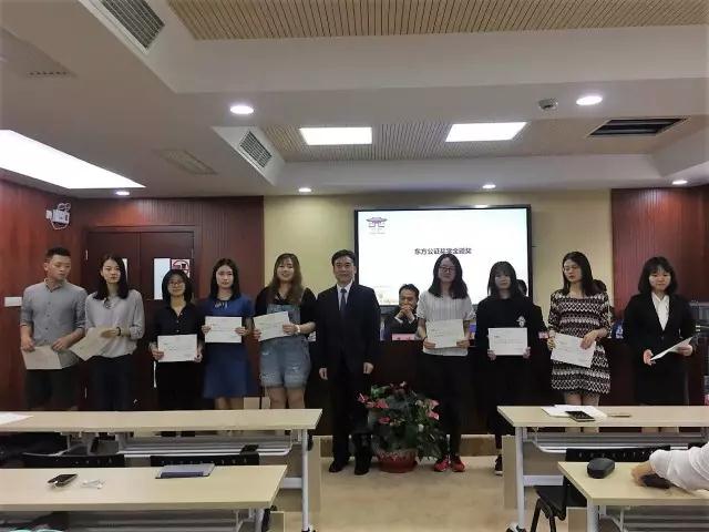 王兴和主任首先发言并为获奖代表颁发证书。他与同学们一起回顾自己的个人成长,表达了自己的情怀。王主任曾在上海政法学院做过17年的教师,却一直有着财经专业的情结。他表示法律人要有情怀,有情怀即是要有工作责任。上海东方公证处原为上海市公证处,是全国、全球最大的公证机构,压力较大,之所以做这么多的业务,正是源于对社会的责任。因此他强调在做任何工作要有情怀有担当。最后他表示欢迎以后同学们能够加入到东方公证处。