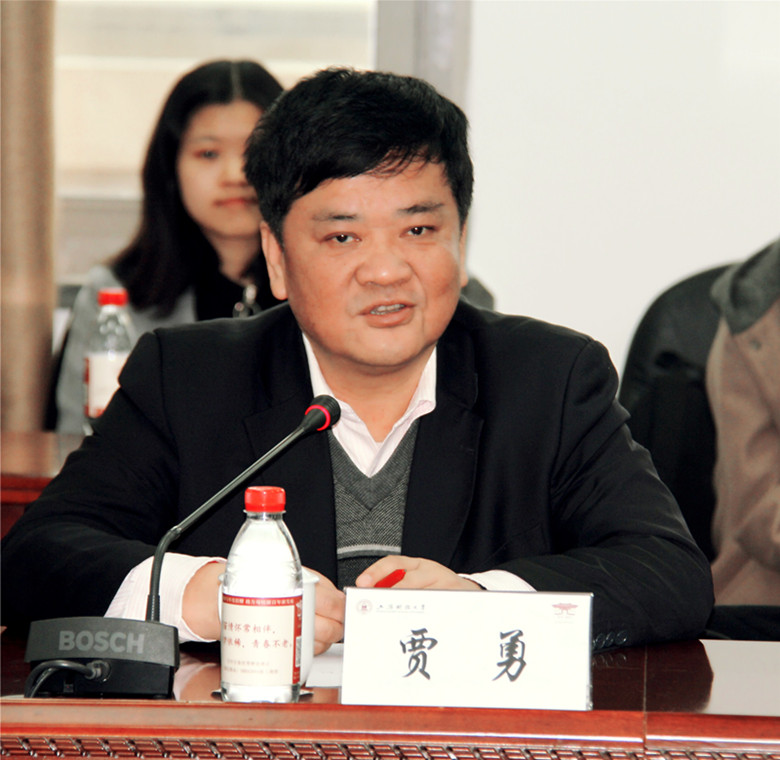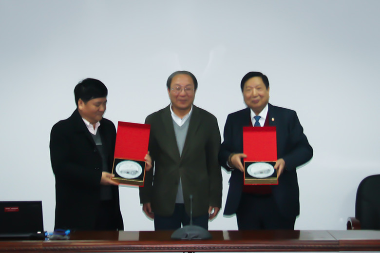 (副校长方华为鲁家贤先生与贾勇秘书长颁发纪念品。)