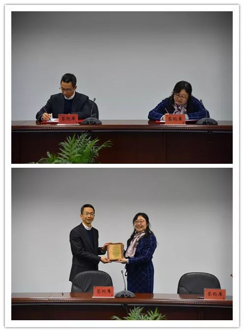 方华副校长与何淼泓董事长共同为联合实验室揭牌,双方互赠纪念品。