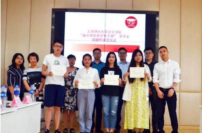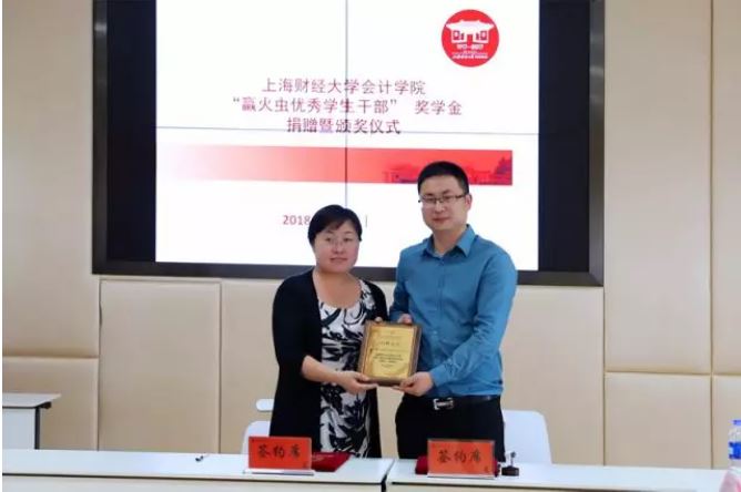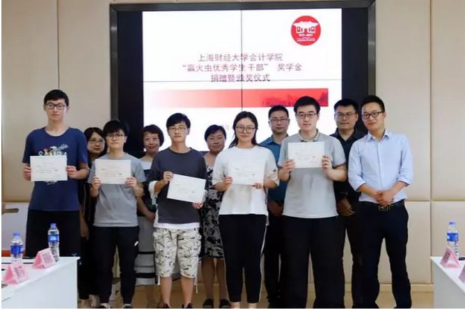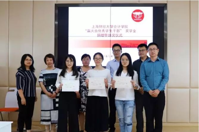 2018年6月4日,赢火虫优秀学生干部奖学金捐赠仪式在我校会计学院106会议室举行,赢火虫信息科技(上海)股份有限公司创始合伙人吴要康,运营总监张家龙,品牌经理秦阳,运营经理王尚玥,上海财经大学合作发展处副处长、基金会副秘书长王峰,会计学院党委副书记黄莎,会计学院办公室主任郜颂倩,会计学院学生办公室主任赵果及赢火虫优秀学生干部奖获奖学生出席捐赠仪式,仪式由会计学院校友会主管高嘉蔓主持。