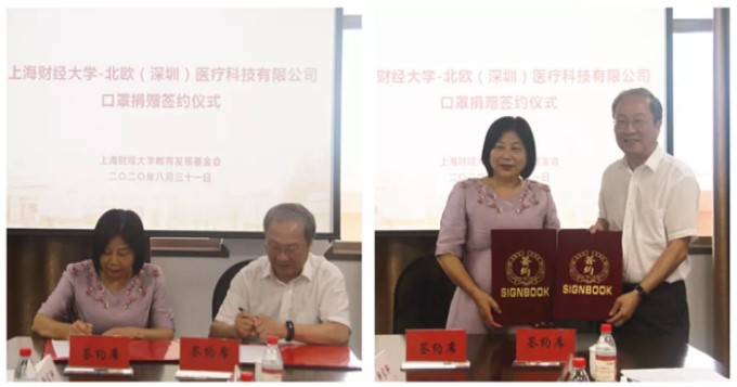 8月31日,北欧(深圳)医疗科技有限公司口罩捐赠签约仪式在校举行,上财EMBA校友会执行会长吴明,北欧(深圳)医疗科技有限公司董事长张巧珍,董事长助理余利,董事殷金喜,上海代表处首席代表靳家轩;上海财经大学校长、校友总会会长蒋传海,副校长、校友总会副会长、基金会理事长方华,商学院党委书记薛丽萍,合作发展处副处长、校友总会副秘书长杨擎宇出席此次捐赠仪式,仪式由合作发展处综合办公室主任吴家瑞主持。