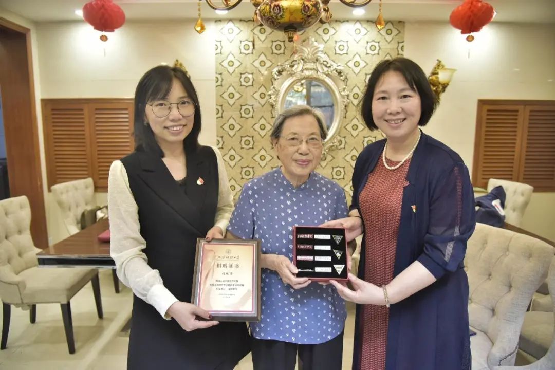 紧接着,合作发展处办公室主任吴家瑞代表学校为程桂芳教授颁发了捐赠证书,并特意送上上海财经大学建校以来的全套学校徽章。收到这份特殊赠礼的程桂芳教授非常喜悦,如数家珍地与在场师生分享了自己在财大学习和工作的经历。