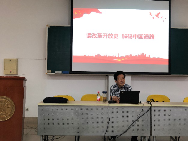 本次活动邀请章忠民教授做《读改革开放史 解码中国道路》专题讲座。章教授从三部分谈中国的改革开放史,一是改革开放触发点和出发点,二是改革开放与中国道路,三是中国道路与中国未来。