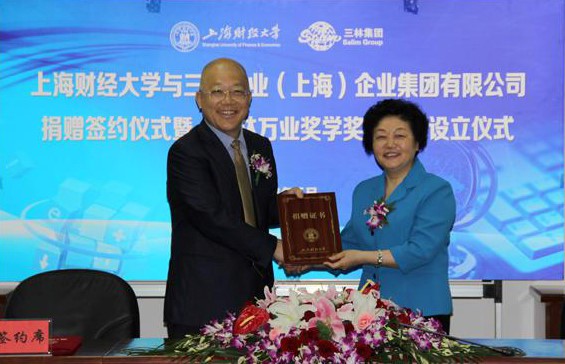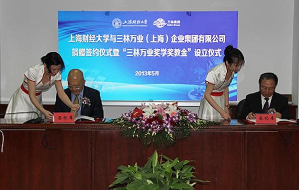 2013年5月15日,上海财经大学与三林万业(上海)企业集团有限公司捐赠签约仪式暨“三林万业奖学奖教金”设立仪式在国定路校区行政大楼三楼会议室隆重举行。我校校董、三林集团中国区总裁程光一行3人出席仪式。校合作发展处负责人主持会议。