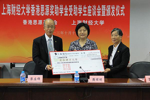 2013年10月13日下午,上海财经大学香港思源奖助学金受助学生座谈会暨颁发仪式在我校行政楼三楼会议室举行。仪式由学生工作(部)处处长冯润民主持,香港思源基金会顾问黎应锦及夫人黎梁淑芷女士代表基金会创办人陈曾焘博士及夫人陈许启明女士,专程赶赴现场并与受助学生座谈交流。
