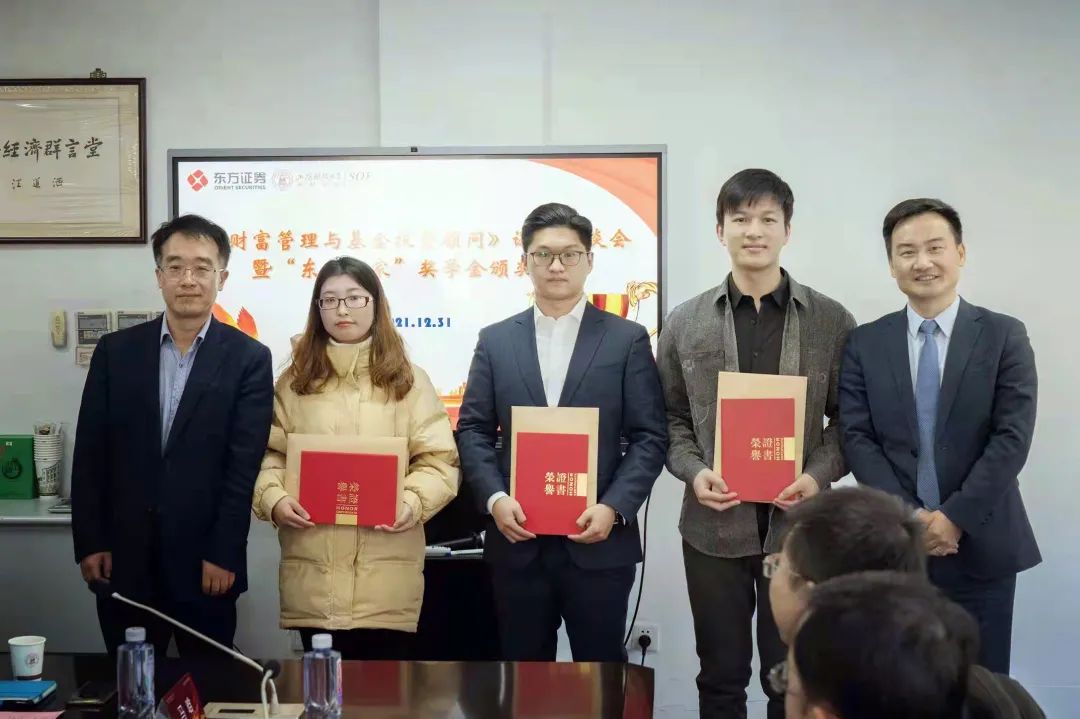12月31日下午,上海财经大学《财富管理与基金投资顾问》课程座谈会暨“东方赢家”奖学金颁奖仪式在武东校区同德楼204举行。东方证券公司副总裁、财富管理业务总经理徐海宁,校党委副书记朱鸣雄,校合发处处长陈红梅,研究生院副院长谢永康,东方证券财富管理业务总部副总经理熊庆东、郭卫峰,合规总监王智慧,资产配置部总经理李欣,财富研究中心总经理陈达飞,综合管理部总经理范圣汀,金融学院常务副院长柳永明、副院长朱小能、党委副书记秦文佳、学院学工办主任刘福忠,《财富管理与基金投资顾问》课程主任马晗,以及荣获“东方赢家”奖学金的同学们一同出席。座谈会由朱小能副院长主持。