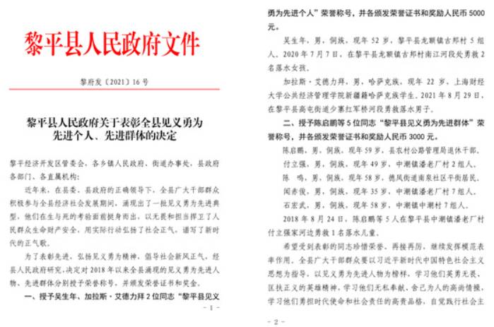 2021年10月,贵州省黔东南苗族侗族自治州黎平县人民政府决定授予上海财经大学公共经济与管理学院加拉斯·艾德力拜同学“黎平县见义勇为先进个人”荣誉称号,表彰加拉斯同学在生与死的考验面前挺身而出,以无畏和担当捍卫了人民群众生命安全,用实际行动弘扬了社会正气,谱写了新时代的青春赞歌。随后,加拉斯同学还荣登由中央文明办组织评选的2021年12月“中国好人榜”,新华社等多家权威媒体报道他的救人事迹。