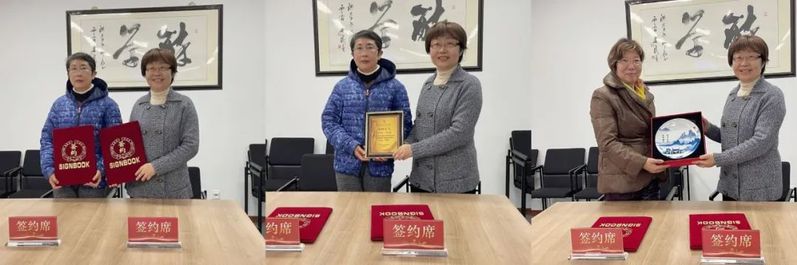 校基金会秘书长陈红梅与哈伟女士共同签署捐赠协议,并分别向哈伟女士和潘育梅女士颁发捐赠证书和上财校训文宣品。