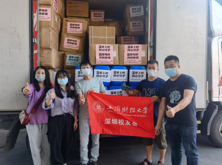 在得知学校紧缺口罩、隔离衣等基本的防疫物资后,深圳校友会邬建辉会长发动深圳校友及社会力量,紧急采购5.5万套隔离衣、2万只口罩等14类防疫物资、第二批又采购了2万份抗原检测试剂、1万顶医用帽等6类紧缺物资,并安排专车从深圳送达上海,缓解了学校防疫物资短缺的压力。从图片上可以看到,每一箱物资上都贴上了“深爱上财、同心守沪”的标语,承载的是校友们对母校满满的爱。